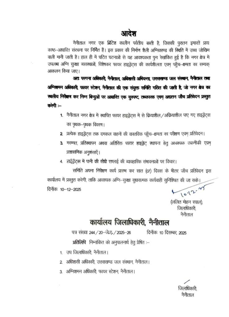 जिलाधिकारी ने इस संबंध में आदेश जारी करते हुए कहा कि नैनीताल नगर एक ब्रिटिश कालीन पर्वतीय बस्ती है, जिसकी पुरातन इमारतें प्रायः काष्ठ-आधारित संरचना पर निर्मित हैं। इस प्रकार की निर्माण शैली अग्निकाण्ड की स्थिति में उच्च जोखिम वाली मानी जाती है। उन्होंने हाल ही में घटित घटनाओं का जिक्र करते हुए कहा कि नगर क्षेत्र में उपलब्ध अग्नि सुरक्षा व्यवस्थाओं, विशेषकर फायर हाइड्रेट्स की कार्यशीलता एवम् पहुँच क्षमता का सम्यक आकलन किया जाना आवश्यकीय है।