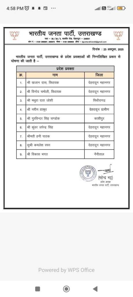 बड़ी खबर-उत्तराखंड भाजपा ने जारी की प्रदेश प्रवक्ताओं की सूची