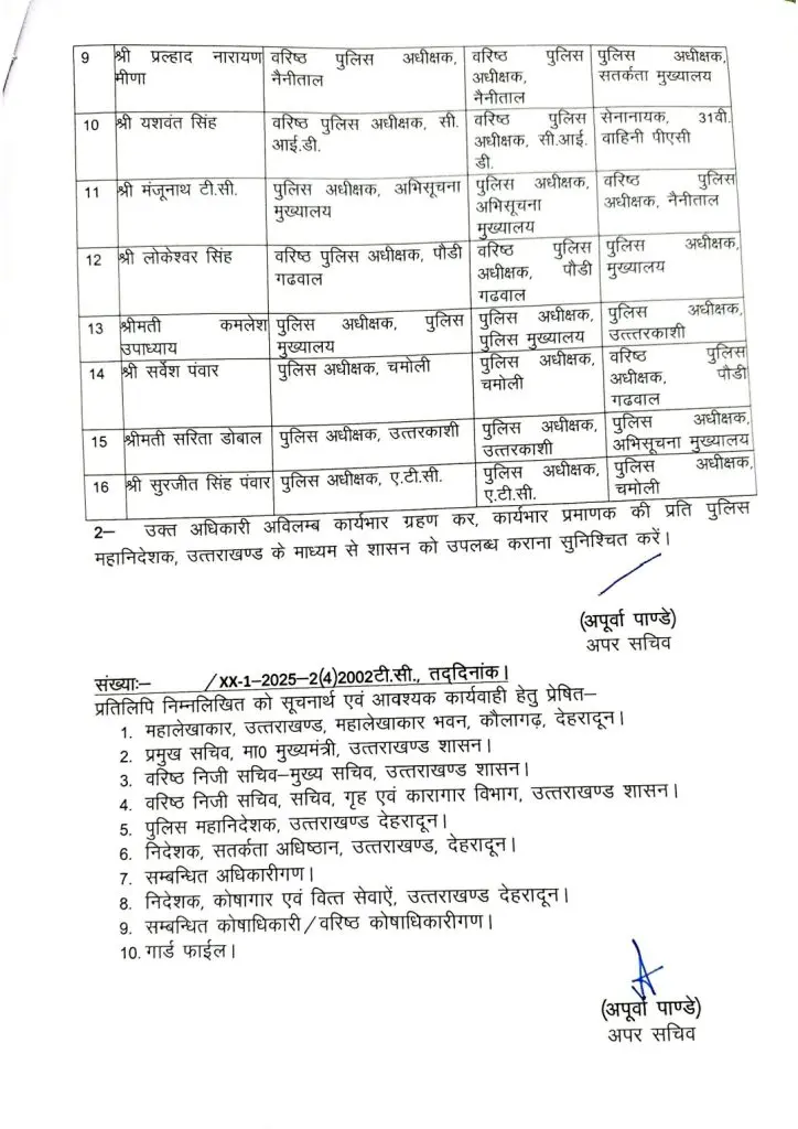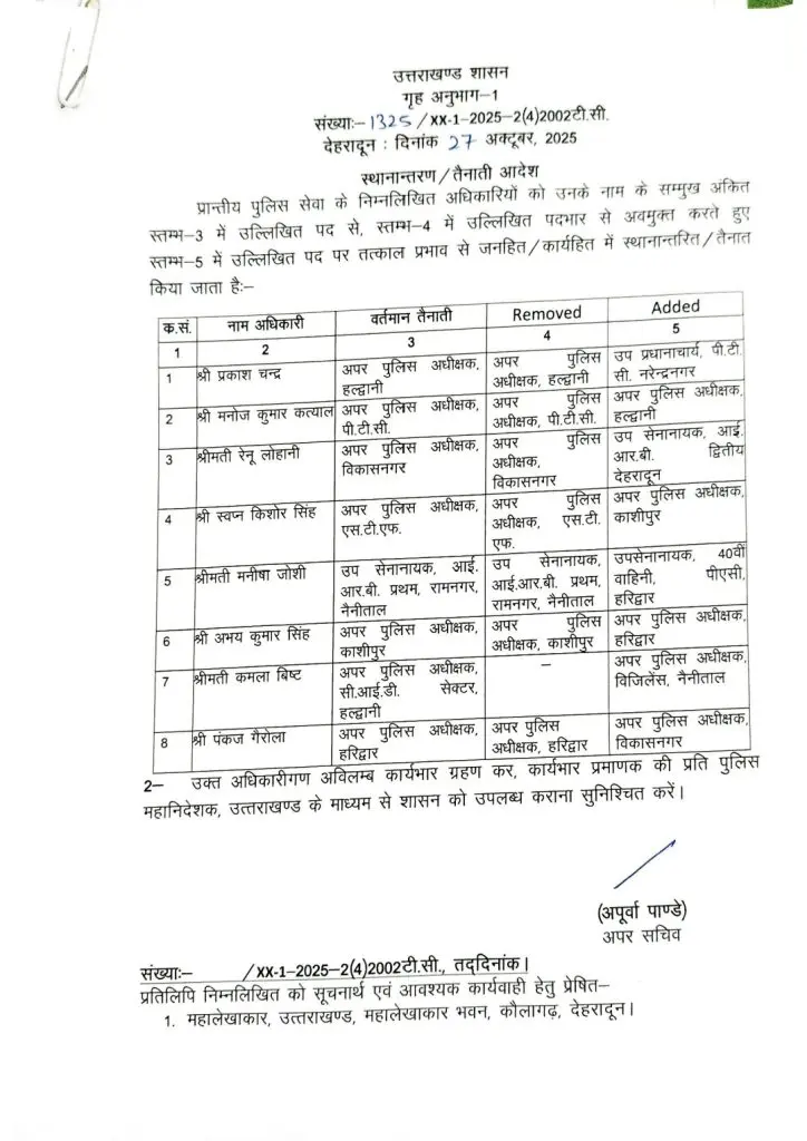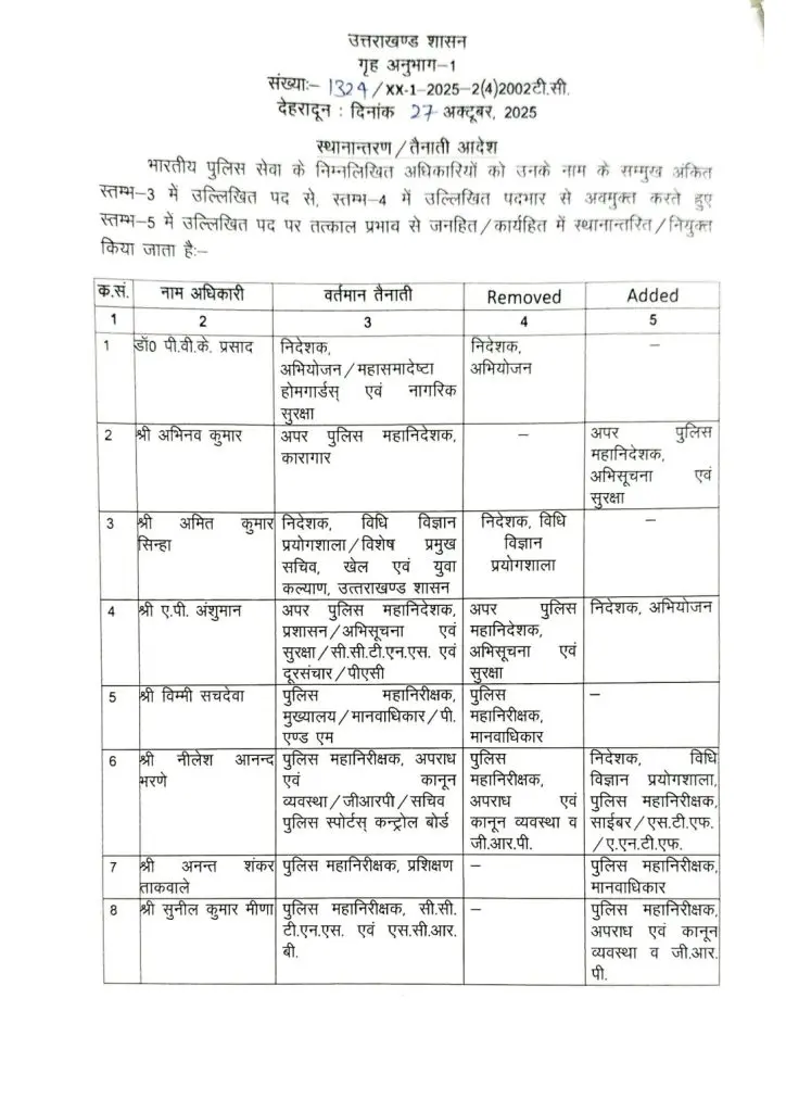 उत्तराखंड शासन ने पुलिस विभाग में बड़ा प्रशासनिक फेरबदल करते हुए कई IPS और PPS अधिकारियों के स्थानांतरण आदेश जारी किए हैं, देखें लिस्ट