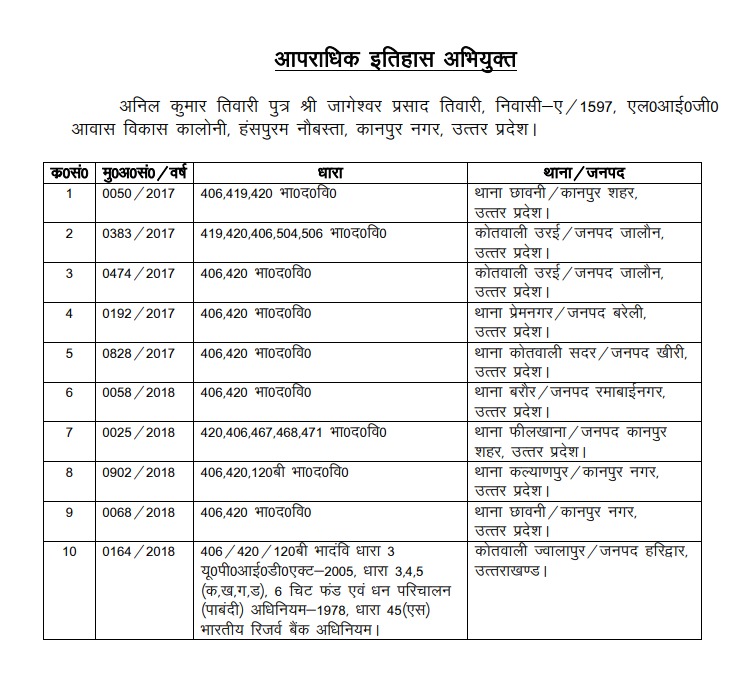 जांच में यह भी सामने आया कि कंपनी के संचालक अनिल कुमार तिवारी और देवेंद्र प्रकाश तिवारी इसमें शामिल थे। दोनों आरोपियों पर 50-50 हजार का इनाम घोषित किया था। आरोपी बीते सात सालों से फरार चल रहे थे और इनके खिलाफ कुल 10 आपराधिक मुकदमे दर्ज हैं, जिनमें से 9 उत्तर प्रदेश के विभिन्न जिलों में पंजीकृत हैं।
