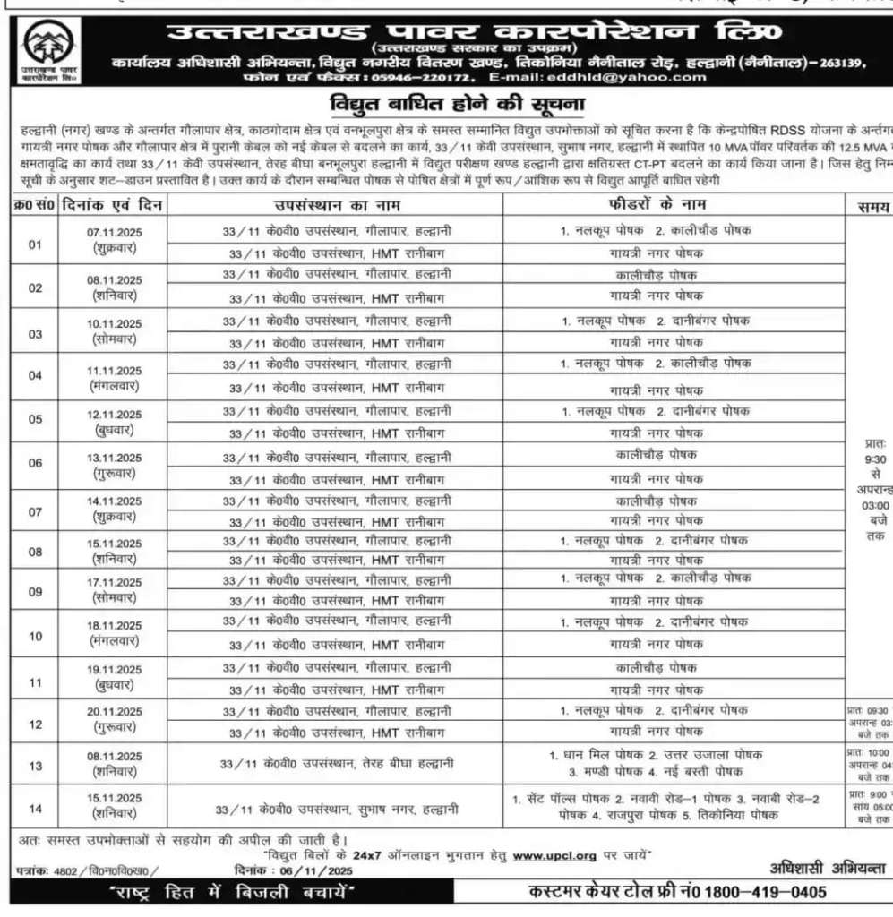 इसके अंतर्गत निम्न कार्य शामिल हैं, गायत्री नगर पोषक एवं गौला पार क्षेत्र में पुरानी केबल को नई केबल से बदलना। 33/11 केवी उपसंस्थान, सुभाष नगर, हल्द्वानी में स्थापित 10 MVA पॉवर ट्रांसफार्मर की क्षमता को 12.5 MVA तक बढ़ाना। 33/11 केवी उपसंस्थान, तेरह बीघा बनभूलपुरा, हल्द्वानी में क्षतिग्रस्त CT-PT को बदलना।इन कार्यों के दौरान संबंधित पोषक से पोषित क्षेत्रों में पूर्ण या आंशिक रूप से विद्युत आपूर्ति बाधित रहेगी। विद्युत विभाग उपभोक्ताओं से सहयोग की अपील करता है और असुविधा के लिए क्षमा प्रकट करता है