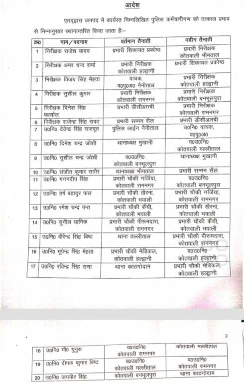 एस0एस0पी0 नैनीताल श्री मंजुनाथ टीसी (I.P.S) द्वारा उपरोक्त निरीक्षक/उप निरीक्षक ना0पु0 के स्थानांतरण तत्काल प्रभाव से उनके नाम के सम्मुख अंकित स्थानों पर किए गए हैं।